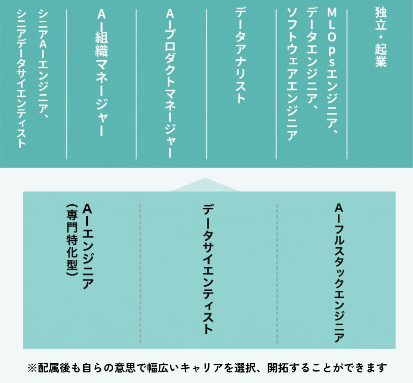 AI技術で世の中に大きなデライトを届けることを目的として日々業務に取り組んでいるAI人材には、AIで事業を成功させるために必要な様々なキャリアパスが用意されています。