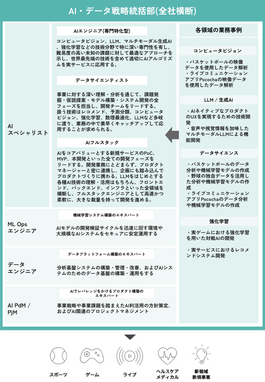 AI技術の専門性・応用力を発揮し、スポーツ・スマートシティ、ゲーム・エンタメ、ライブストリーミング、ヘルスケア・メディカル、そして新規事業などDeNAのコア事業の成長を加速/変革させる役割を担います。